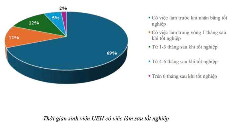Đáng chú ý, 69% sinh viên có việc làm ngay trước khi nhận bằng, 12% tìm được việc trong vòng một tháng sau tốt nghiệp và chỉ khoảng 2% mất trên 6 tháng để có việc làm. Kết quả này cho thấy khả năng thích ứng nhanh của sinh viên UEH với thị trường lao động.
