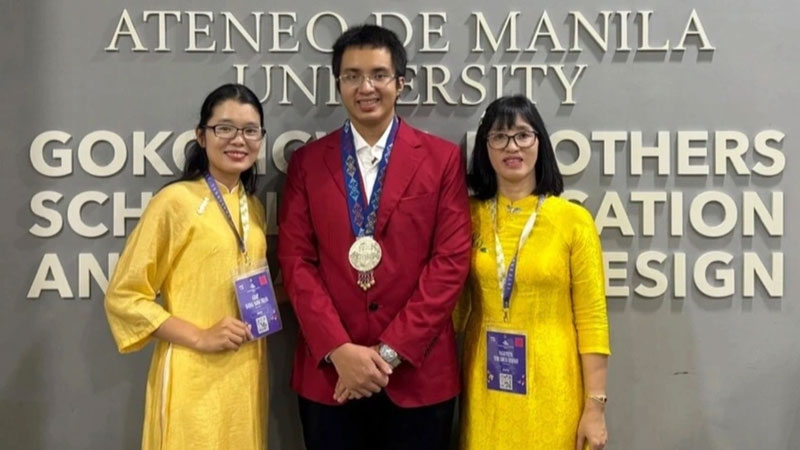 Cô Hạnh (bên phải) và cựu học sinh Trường THPT chuyên Quốc học Huế tại kỳ thi IBO năm 2025 (Ảnh: Nhân vật cung cấp).