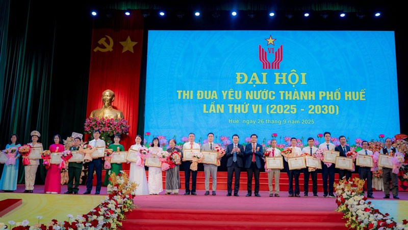 Cô Nguyễn Thị Diệu Hạnh (thứ 8 từ trái qua) được nhận Bằng khen của Chủ tịch UBND thành phố Huế tại Đại hội Thi đua yêu nước thành phố lần thứ VI (Ảnh: UBND thành phố Huế).