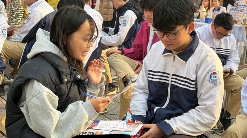 Học sinh Trường THPT Cao Bá Quát Gia Lâm (Hà Nội) được tư vấn về tuyển sinh ĐH năm 2026. (ảnh: Hà Linh)