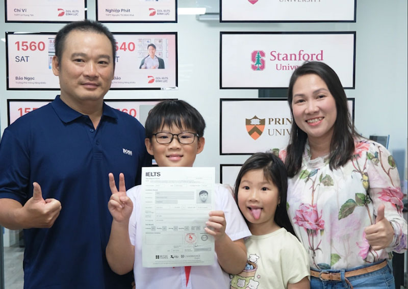 Ở lần thi đầu tiên, cậu học sinh 10 tuổi đạt điểm 8.5 ở cả 3 kỹ năng là reading (đọc), listening (nghe), speaking (nói); kỹ năng writing (viết) đạt 7.0. Do đó, điểm tổng thể (overall) là 8.0.