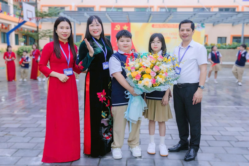 Bùi Nguyên Gia Bảo bên cô hiệu trưởng Vũ Thị Thìn (áo dài hoa) và 2 phó hiệu trưởng của Trường THCS Tây Mỗ 3. Ảnh: NVCC
