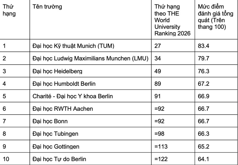 Bảng xếp hạng 10 trường đại học hàng đầu Đức năm 2026 theo Bảng xếp hạng THE World University Ranking 2026: