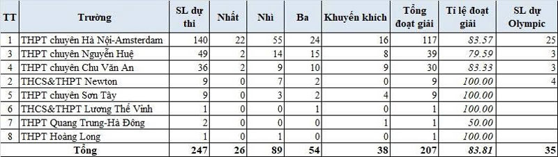 Năm nay, toàn thành phố có 247 thí sinh dự thi thì số lượng thí sinh đến từ Trường THPT Chuyên Hà Nội Amsterdam chiếm hơn một nửa (140 em). Học sinh trường này cũng ẵm nhiều giải nhất, có thể nói là gần như toàn bộ giải nhất của Hà Nội với số lượng 22/26 giải. Bên cạnh đó, còn có 55 giải nhì, 24 giải ba và 16 giải khuyến khích. Với tổng số 117 giải/140 em dự thi, tỉ lệ học sinh đạt giải của trường này lên tới 83,5%.