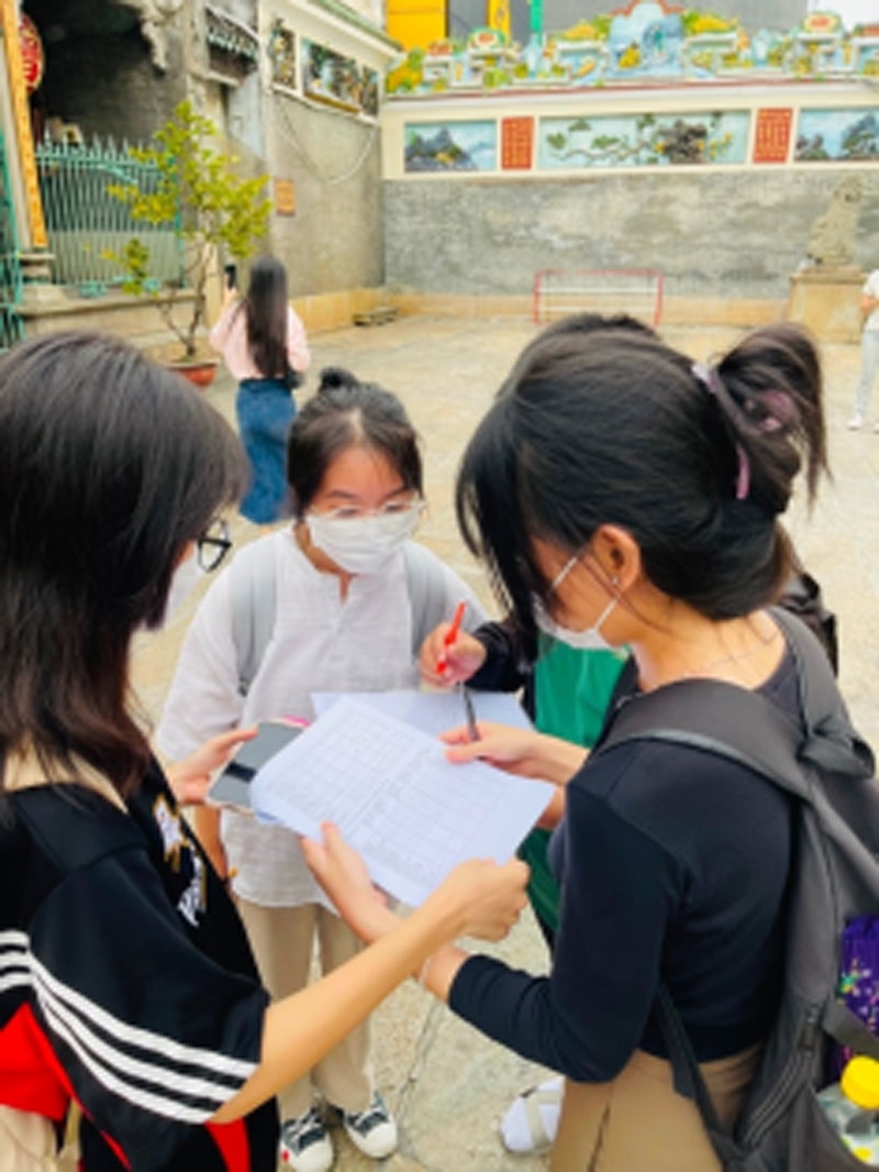 Sinh viên ngành Xã hội học Trường ĐH KHXH&NV TP.HCM thảo luận bảng hỏi để phỏng vấn cộng tác viên. Ảnh HCMUSSH