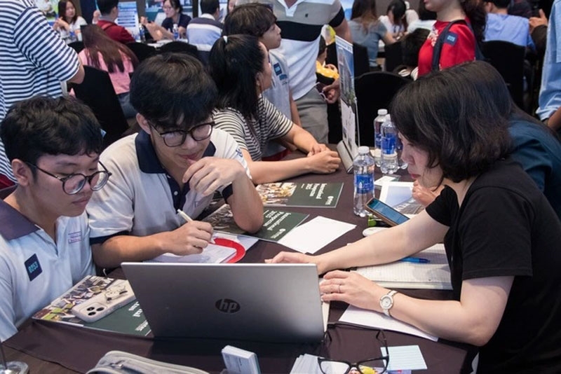 Đại diện một học viện kỹ thuật và công nghệ New Zealand giới thiệu các chương trình đào tạo với học sinh Việt. Ảnh: Ngọc Long