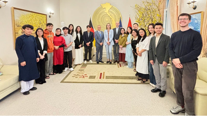 Thu Thủy cùng các bạn đại diện các quốc gia có cơ hội giao lưu với Đại sứ quán Việt Nam ở Berlin (Ảnh: NVCC).