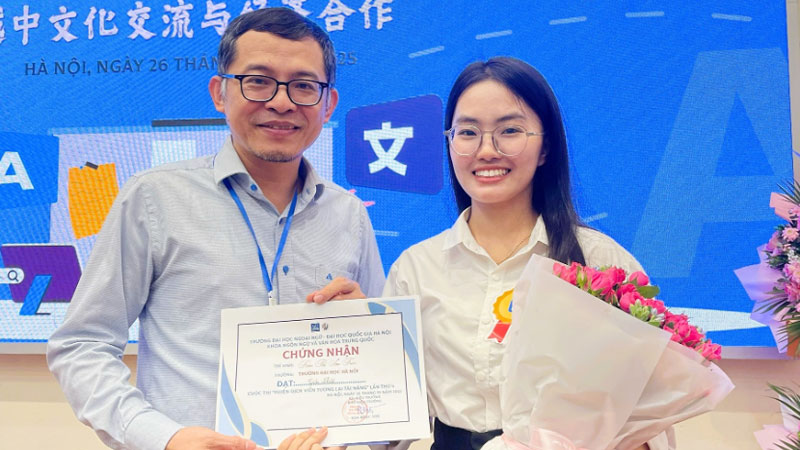 Trần Thị Sơn Trúc (sinh viên năm thứ tư Trường ĐH Hà Nội) giành ngôi vị quán quân ở cuộc thi phiên dịch Trung - Việt. Ảnh: NVCC