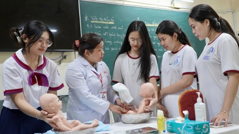 Học sinh trải nghiệm tiết học hướng dẫn chăm sóc trẻ sơ sinh. Ảnh: Huyên Nguyễn