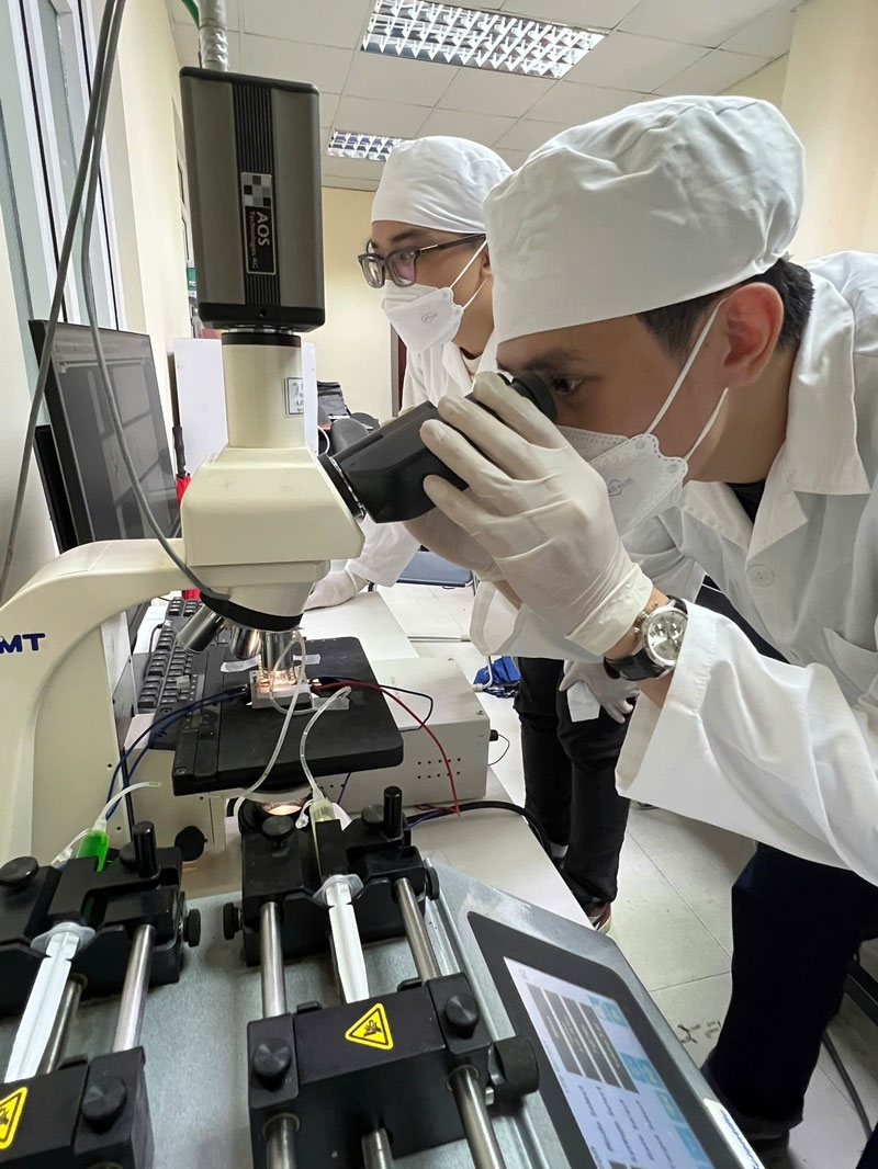 Sinh viên thực hiện thí nghiệm tại phòng nghiên cứu của khoa Điện tử Viễn thông, Trường ĐH Công nghệ (ĐH Quốc gia Hà Nội).n Ảnh: UET