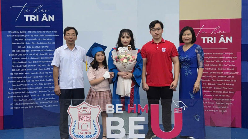 Thu Hà (người mang hoa) bên người thân trong lễ tốt nghiệp. Ảnh: NVCC
