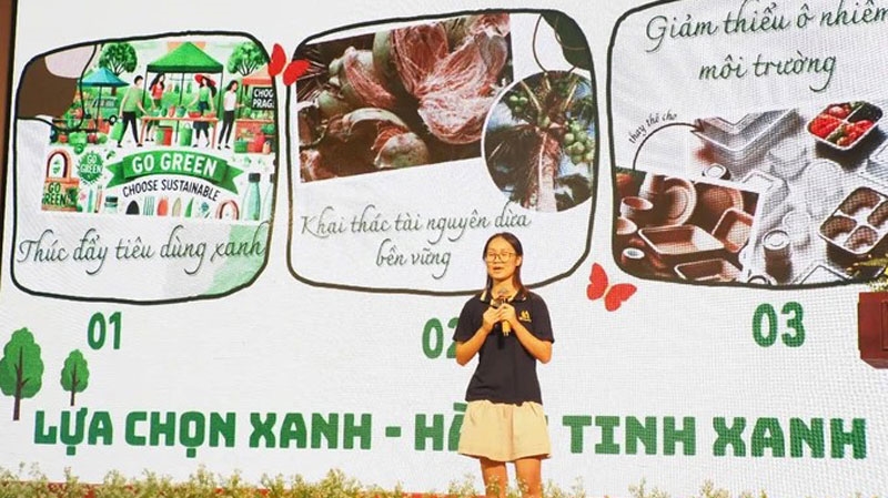 Học sinh Trường THPT Việt Mỹ Anh (quận 11, TPHCM) báo cáo dự án "Giải pháp bền vững từ xơ dừa sản xuất hộp thực phẩm dùng 1 lần"