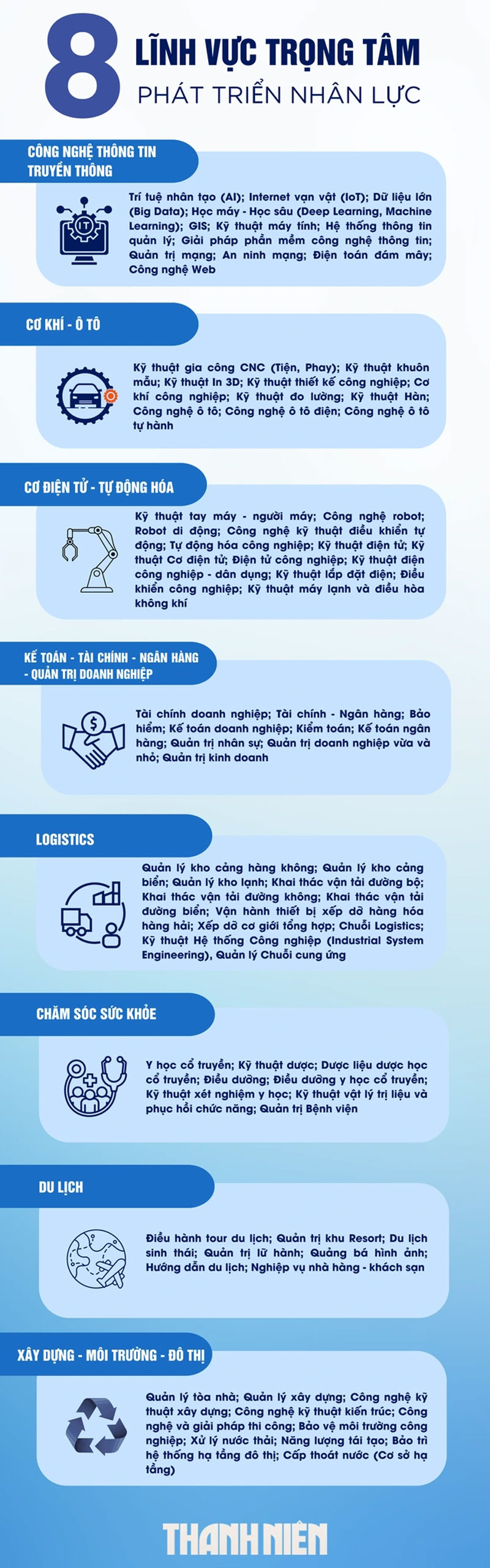 8 lĩnh vực gồm: công nghệ thông tin - truyền thông, cơ khí - ô tô, cơ điện tử - tự động hóa, kế toán - tài chính - ngân hàng - quản trị doanh nghiệp, logistics, chăm sóc sức khỏe, du lịch, xây dựng - môi trường - đô thị.