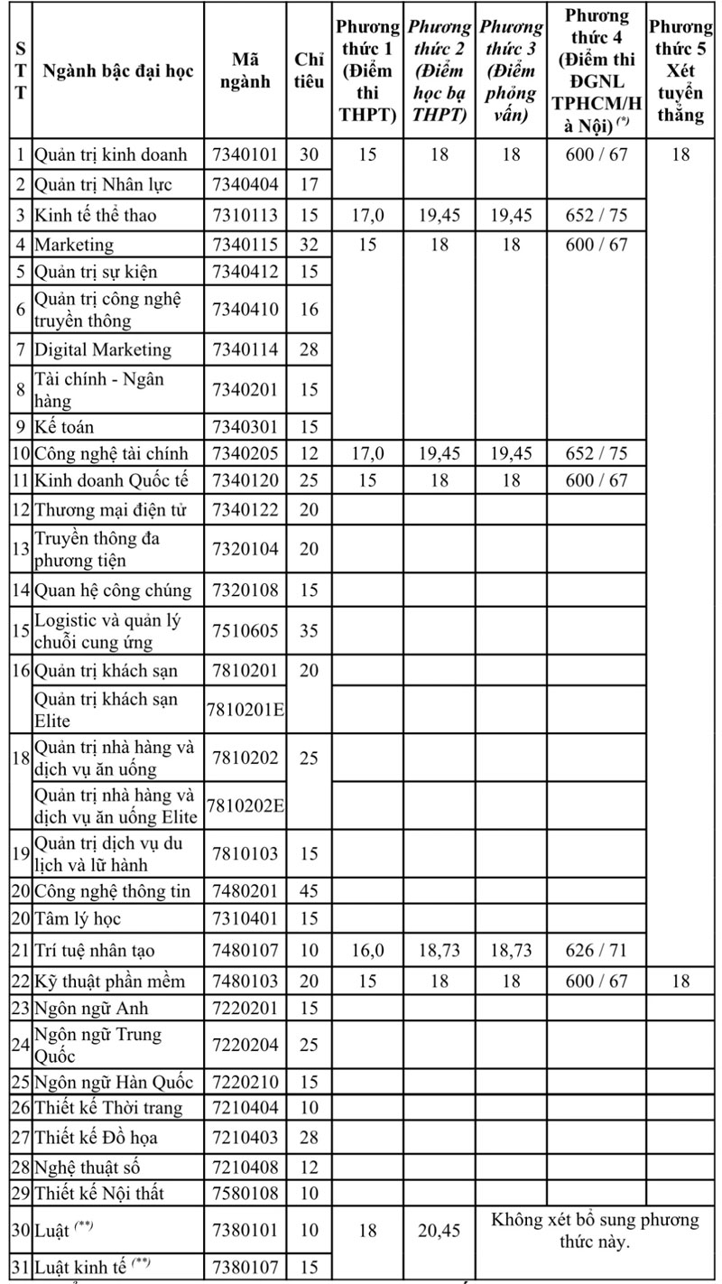 Cụ thể, Trường ĐH Hoa Sen xét tuyển bổ sung 600 chỉ tiêu của 31 ngành, trong đó có nhiều ngành học đang có nhu cầu nhân lực cao như marketing, quản trị sự kiện, digital marketing, truyền thông đa phương tiện, logistics và quản lý chuỗi cung ứng, thiết kế đồ họa, luật…