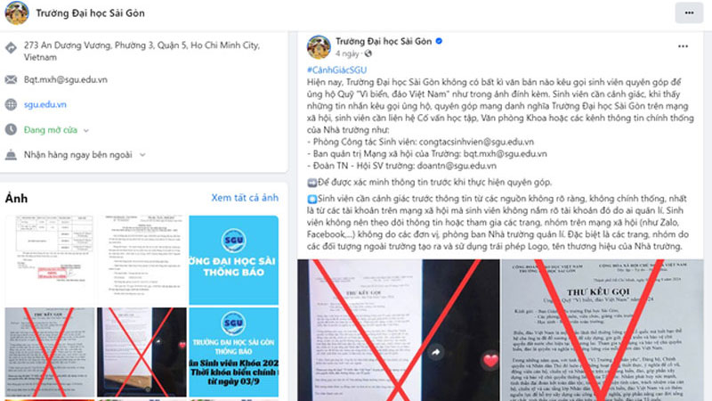 “Khi thấy những tin nhắn kêu gọi ủng hộ, quyên góp mang danh nghĩa trường Đại học Sài Gòn trên mạng xã hội, sinh viên cần liên hệ cố vấn học tập, văn phòng khoa hoặc các kênh thông tin chính thống của nhà trường.