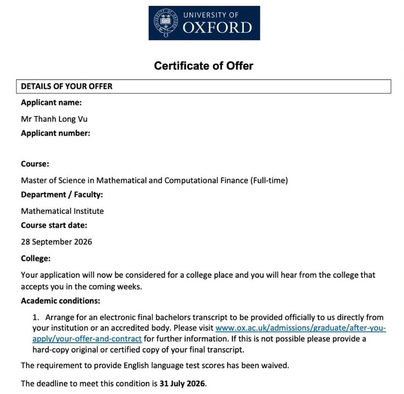 Đối với Oxford, Thành Long trúng tuyển thạc sĩ ngành Toán và Tài chính tính toán - một trong những ngành học cạnh tranh nhất tại ngôi trường này. Năm 2025, trong 712 hồ sơ gửi về, trường chỉ nhận 59 sinh viên.