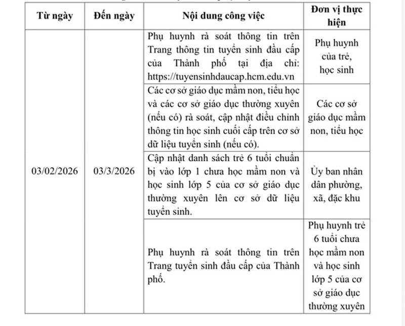 Để đảm bảo dữ liệu của học sinh phục vụ cho kế hoạch tuyển sinh đầu cấp năm học 2026-2027, Sở GD-ĐT TP.HCM đề nghị UBND phường, xã, đặc khu, chỉ đạo các trường mầm non và trường tiểu học triển khai thực hiện nghiêm túc việc rà soát dữ liệu.